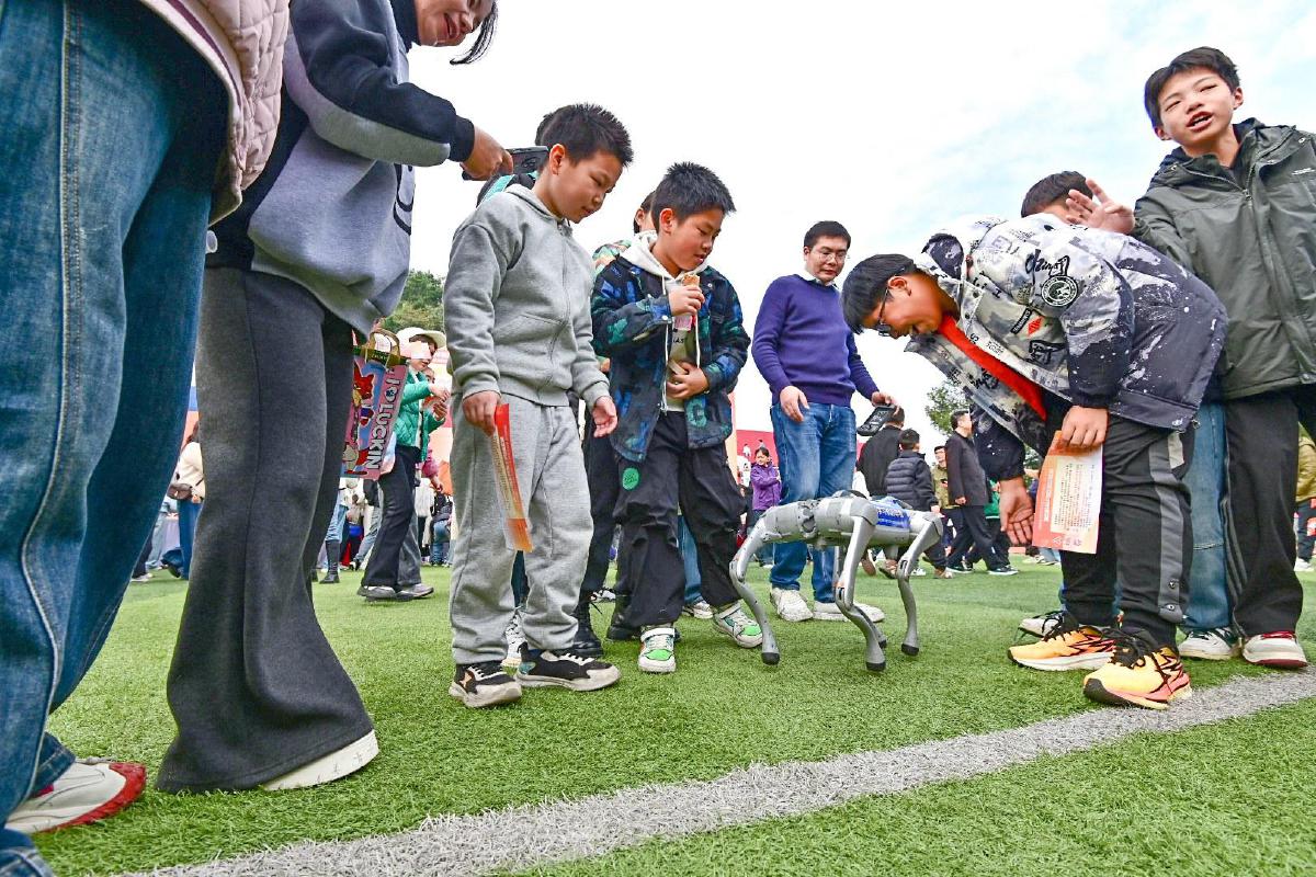 漫步展会现场,每个展位前都围满了好奇的脑袋。宇树机器人、“龙狮”机器狗展位前人气爆棚,成为全场焦点。活动现场,黄金山第五小学学生黄川栗正和来自黄石市青少年机器人科普协会的宇树机器人赛跑。随着一声令下,机器人迈着灵活的步伐向前奔跑,黄川栗紧随其后,脸上洋溢着兴奋的笑容。