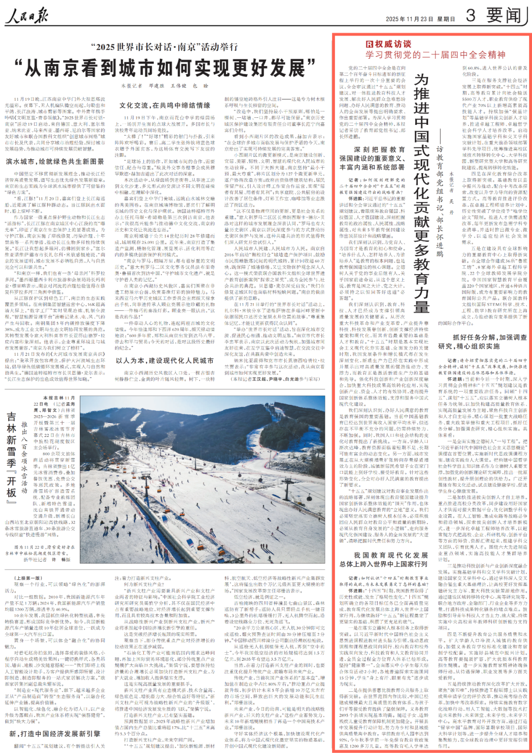 怀进鹏:习近平总书记的重要讲话和全会审议通过的“十五五”规划建议,着眼统筹教育强国、科技强国、人才强国建设,深刻把握教育的政治属性、人民属性、战略属性,对未来5年教育强国建设作出顶层设计和战略擘画。